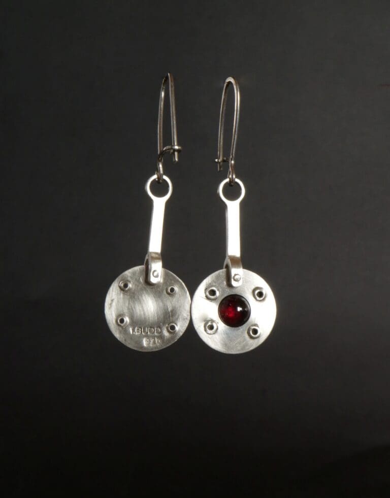 With a cool mechanical vibe, This pair of rivet set garnets in brushed silver earrings, have a lovely free movement and are ready to party. Approx. 5mm cabochon garnets in brushed silver discs, 50mm in length and 16mm wide. Closed earring hooks for extra security.